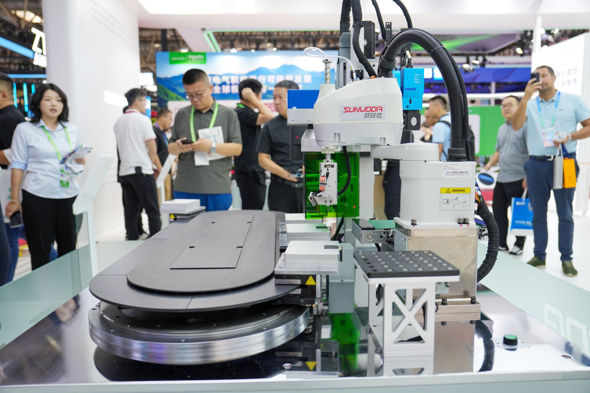 2025𻂏�日,在北京举行的第三届中国国际供应链促进博览会上,参观者在欣旺达展台参观磁悬浮输送产线展示。新华社记者 鞠焕宗 摄