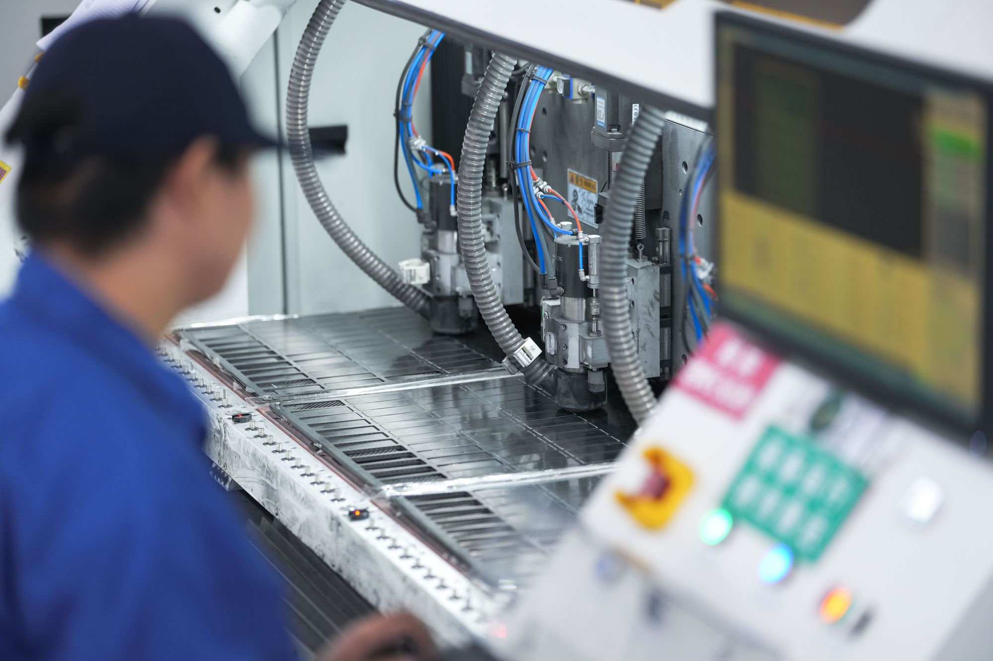 工作人员在吉林化纤集团国兴复材有限公司车间操控雕刻机加工碳纤维复材制件(2025𻂑�日摄)。新华社记者 许畅 摄