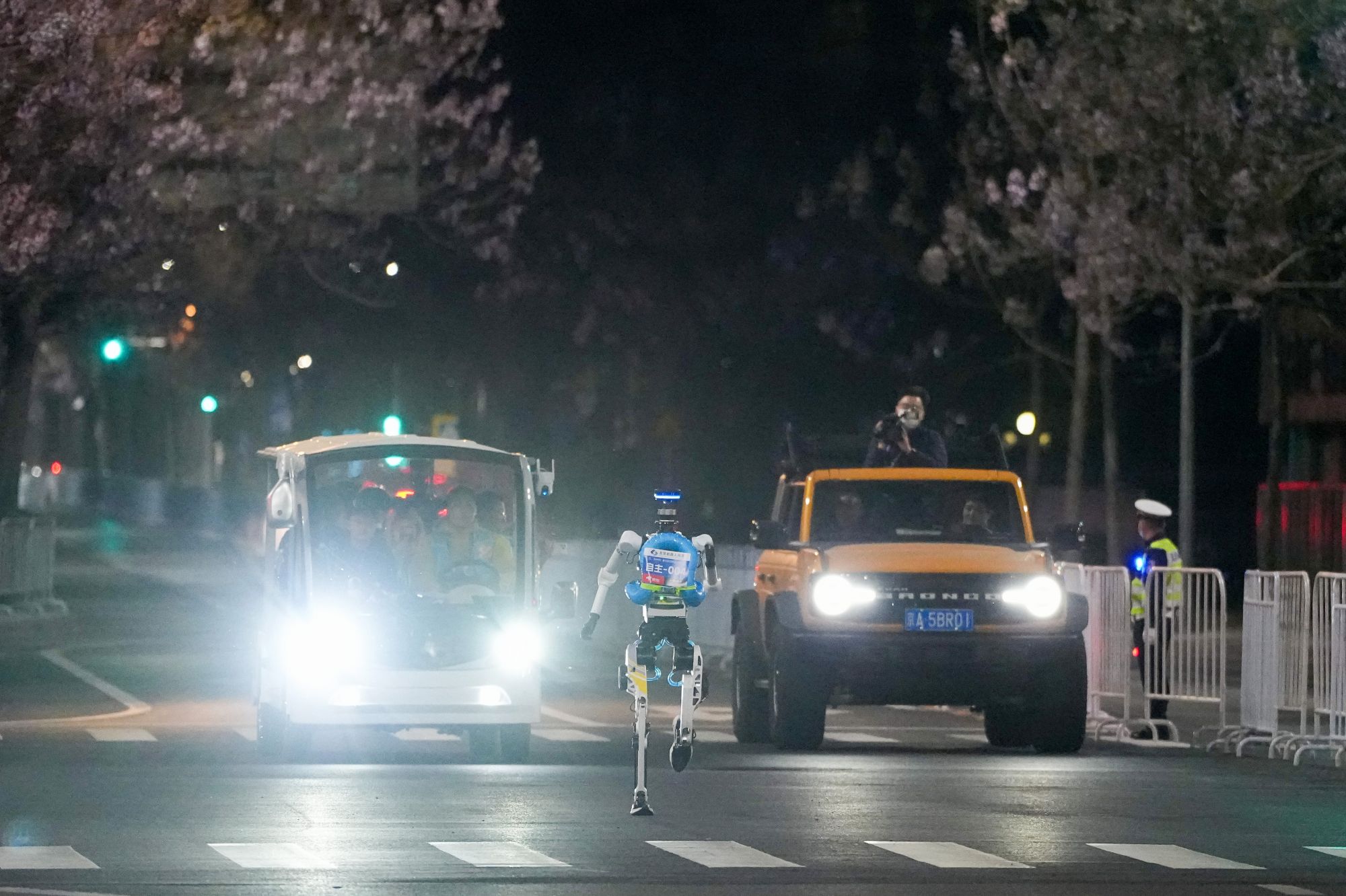 2026𻂌�日晚,一台机器人在测试活动中奔跑。4�日晚񑎂�日凌晨,2026北京亦庄人形机器人半程马拉松全流程全要素测试活动在北京经开区举行。新华社记者 鞠焕宗 摄